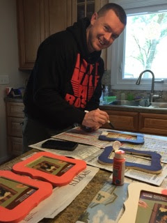After church I went to Michaels then came back to pick up Dave after 3rd service. He had no clue that he would be crafting when we got to my parents house but he enjoyed it. The polka dots were his idea ;) For $13 we made 6 picture frames that match our wedding colors! We plan to put 6 of our favorite pictures of us in them to have around the reception area.